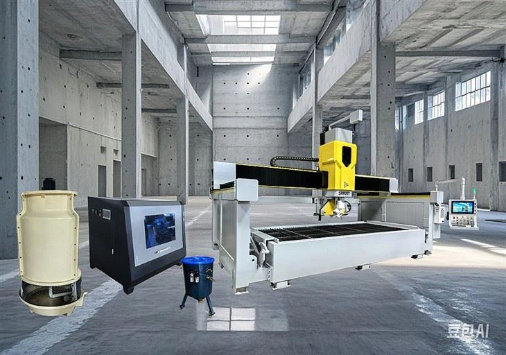 This machine can not only perform efficient Line cutting by Blade Saw, but also can process various curves and small angles by Water jet. It can process stones with high hardness , such as sintered stone, porcelain, ceramic, etc. Making it easy for stone chamfering, basin hole and internal angles processing. The processing method of this machine is flexible and convenient, with a high degree of automation and simple operation. This machine has powerful functions, is a high-end smart 5-AXIS CNC SMART BRIDGE SAWJET specially developed by our company for the home furnishing and cabinet countertop processing. It is currently the most advanced stone processing machine in the stone industry.