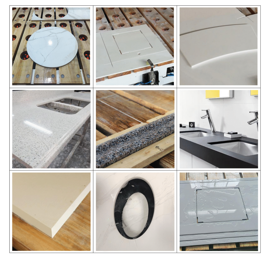>Stone countertops with digging basin holes and European borders: suitable for cabinet artificial stone, quartz stone, granite, marble countertops and sinks, kitchen countertops, bathroom countertops, special-shaped bar counters, stone coffee table countertops, basin hole cutting, back-arc water forming And polishing, etc.;