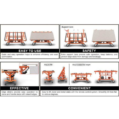 The Max Aggressive Kitchen Installation Cart offers a safe and efficient solution for transporting slabs. It is designed for easy movement, lifting, and lowering of slabs during installation, with flexible orientation changes.