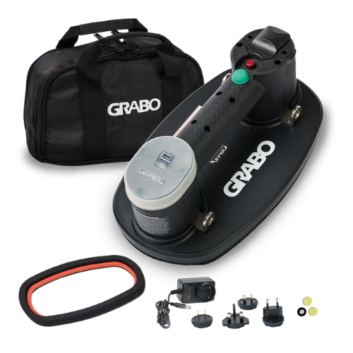 The GRABO 1 Battery 1 Seal Kit delivers powerful, reliable lifting in a compact and easy-to-use design. Perfect for handling stone, tile, glass, and other flat materials, this kit includes the GRABO Classic electric vacuum lifter with an analog pressure gauge, one battery with charger, a pre-installed foam rubber seal, a rugged nylon carrying bag, replacement filters, and a user manual. Built for professionals who demand strength, safety, and convenience on the job.